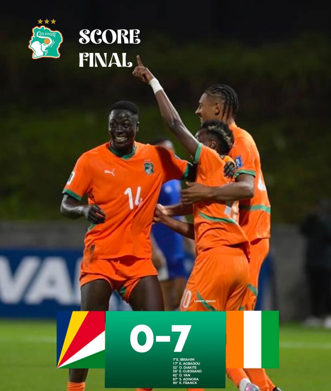 A la reprise. La Côte d’Ivoire est toujours aussi pimpante. En soliste, Yann Diomandé régale et marque le 5e but des Orange venus d’Abidjan (55e, 0-5). S’en suivra une 6e réalisation de Simon Adingra, entré en jeu, après un service de Touré Bazoumana (67e, 6-0). Kessié va ajouter un 7e but pour envoyer la Côte d’Ivoire au 7e ciel (90e, 7-0). Au match aller, les Seychelles avaient pris 9 buts. Ça fait donc 16 buts sur l’ensemble des deux rencontres entre les deux pays dans ces qualifications. Il ne reste plus qu’à finir le boulot à Abidjan, face au Kenya, lors de la 10e et dernière journée pour composter définitivement le ticket pour USA, Mexique et Canada 2026. ” On aurait signé pour une courte victoire mais on en a mis 7. C’est bien. On a surtout vu des jeunes qui se sont bien comportés. Ça va être un grand souvenir pour eux. On va rentrer à Abidjan et bien se reposer pour attaquer la finale à Ebimpé le 14 Octobre 2025 face au Kenya. Nous restons sereins même si le Gabon est en embuscade. Nous avons toujours été devant dans ces éliminatoires. Nous espérons nous qualifier”, a analysé Fae Emerse, en conférence de presse d’après-match.